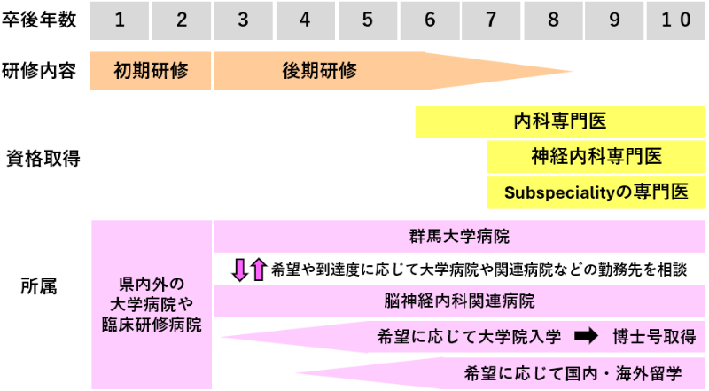 当科で扱う疾患には社会的関心が高いものが多く、脳神経領域を診ることができる医師はさまざまな場面で求められます。当科は県内唯一の大学病院における脳神経内科として、一般内科外来や救急外来で遭遇する機会の多いcommon diseasesから、専門性の高い神経難病まで、幅広く経験できる環境のもとで研修を行っています。