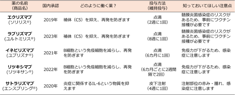 現在は再発を強力に抑える生物学的製剤(特定の分子を標的とする治療薬)が複数使用可能となっています。これらの治療は、補体やIL-6など免疫反応の重要な経路を選択的に抑えることで、再発率の大幅な低下が示されています。
