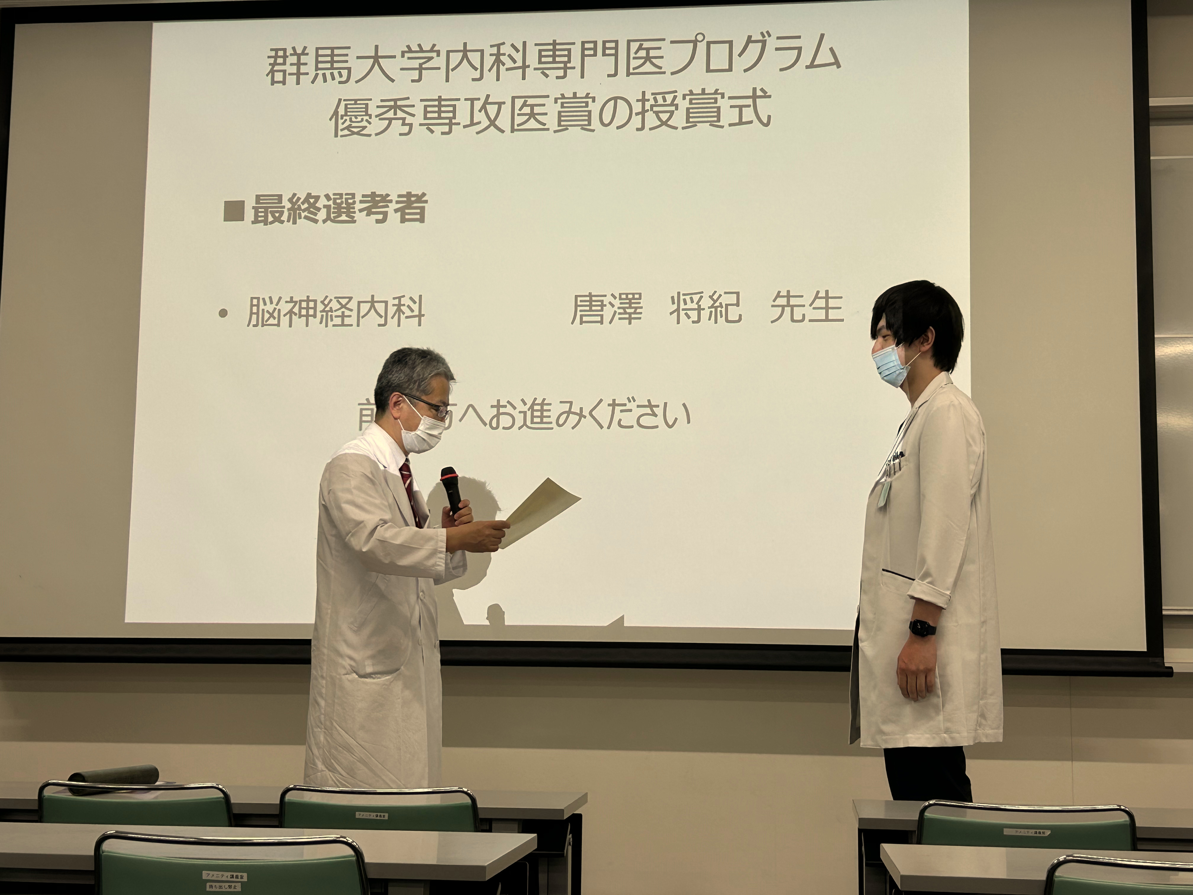 群馬大学内科診療センターグランドカンファレンスにて当科 唐澤将紀先生が優秀専攻医に選出されました。おめでとうございました。 ![]() 2025年8月20日 当科同門 丸山琴音先生・反町隼人が神経内科専門医試験に合格され、池田教授から工藤式ハンマー(通称:ゴールデンハンマー)が授与されました。御両名とも合格おめでとうございます。 22024年10月19日(土)にエテルナ高崎で「第6回 日本脳サプリメント学会 学術大会」を当科が主催します。サプリメントの様々な脳疾患と脳の健康増進に対する効果を研究するユニークな学会です。皆様奮ってご参加いただきますよう、よろしくお願いいたします。 →詳細はこちら ![]() 22024.6.22 藤田行雄先生が群馬大学医学部保健学科作業療法学教授に就任されました。6月22日に群馬ロイヤルホテルにて就任祝賀会が開催されました。ご就任おめでとうございます。 令和7年度入局 医局説明会のご案内です。 ![]() 2024.4.10 神経内科専門医合格者に池田教授より記念品の贈呈が行われました 2023年度(第49回)日本神経学会神経内科専門医試験が実施され、当教室からは 丸山 篤造 (群馬大学医学部附属病院) 道崎 瞳 (群馬大学医学部附属病院) 星野 礼央和 (群馬大学医学部附属病院)) の3名の新規合格者が認定されました。 池田教授からは、「神経内科専門医合格記念」と「氏名」が刻印された工藤式打腱器が贈呈されました。 新た上記3名の神経内科専門医を加え、当教室は今後も群馬県の神経内科診療に尽力していきます。